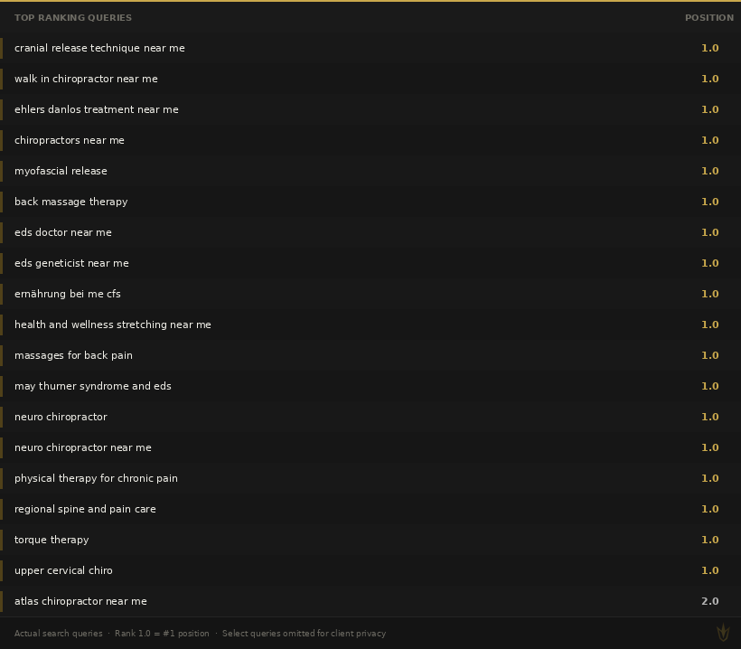 Every search below sends a potential patient directly to her door. Position 1.0 = #1 on Google.